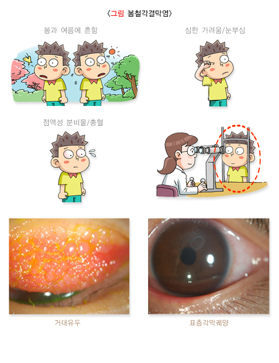 봄철각결막염은 따뜻해지는 계절을 중심으로 매우 심한 가려움을 호소하며 끈끈하고 실 같은 점액성 분비물과 각막의 염증으로 인한 눈부심, 눈꺼풀처짐, 눈꺼풀연축이 발생할 수 있습니다.