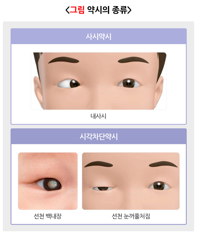 약시는 두 눈에, 혹은 한 눈에만 생길 수 있습니다. 두 눈 모두 심한 굴절이상이 있으면 두눈약시가 생길 수 있고. 한눈약시는 원인에 따라 두 눈의 굴절이상 차이로 인한 굴절부등약시와 두 눈의 상대적인 위치가 바르지 않은 사시로 인한 사시약시, 다양한 눈질환으로 인해 시각경로가 차단되어 발생하는 시각차단약시가 있습니다.