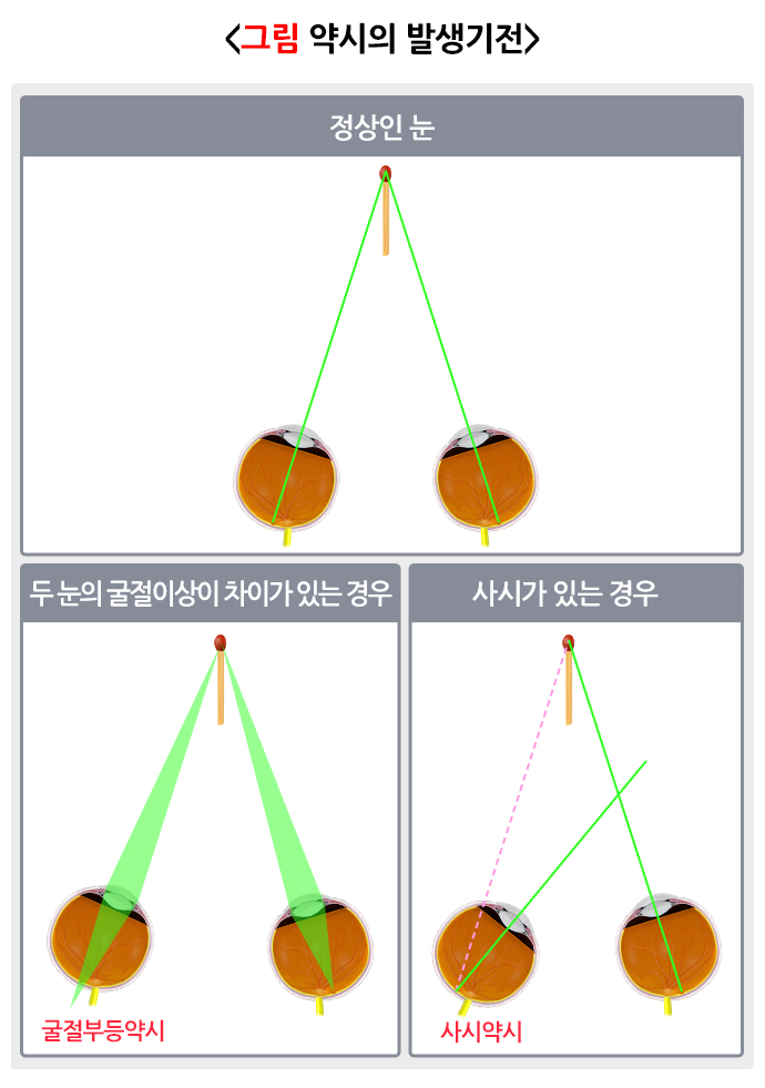 굴절부등약시는 겉으로 보기에는 아무런 이상이 없고 대부분의 경우 어릴 때부터 선명한 이미지를 경험하지 못해 특별히 불편함을 느끼지 못하며, 느끼더라도 나이가 어려서 표현하지 못하는 경우가 많습니다. 더욱이 한눈약시는 시력이 좋은 눈이 있기 때문에 취학 전 시력검사를 통해 약시가 발견되는 경우가 많습니다. 반면 사시약시는 두 눈이 바라보는 방향이 일치하지 않는 사시를 동반하고 있어 굴절이상약시에 비해 겉보기에 눈에 띄어서 상대적으로 빨리 발견되고, 사시 검사 과정에서 약시가 진단됩니다.