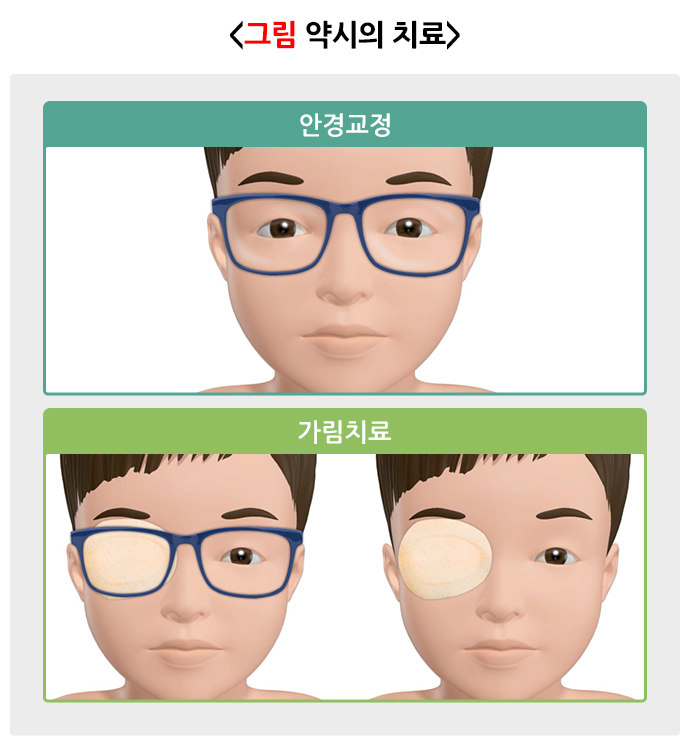 약시치료방법에는 굴절이상 교정, 가림치료, 처벌치료가 있습니다. 굴절이상을 교정하는 것은 약시치료에서 가장 중요하고 가장 먼저 해야 합니다. 안경이나 렌즈를 착용하고 16~22주 후 굴절교정만으로도 평균 두 줄 이상 시력이 호전되는 것으로 알려져 있습니다. 심지어 약시의 1/3은 굴절교정만으로도 약시가 치료될 수 있습니다. 또한 굴절교정을 통해 시력이 호전되면 가림치료도 훨씬 잘 할 수 있게 됩니다. 따라서, 가림치료를 시작하기 전에 반드시 굴절교정을 먼저 해야 합니다. 좋은 눈을 가리는 가림치료는 가장 효과적인 약시치료방법으로 전 세계적으로 널리 통용되고 있는 치료방법입니다. 3~8세 소아에서 굴절교정 후 가림치료를 추가로 시하면 6주 이내에 두 줄에서 네 줄까지 추가로 시력이 향상되는 것으로 알려져 있습니다. 7세 이상인 경우보다 5세 미만에서 가림치료효과가 더 좋습니다. 하지만 가림치료가 끝난 다음에도 약시가 재발할 수 있어서 정기적인 안과검사가 필요합니다. 좋은 눈에 아트로핀 안약을 점안하는 처벌치료도 가림치료와 비슷한 효과를 얻을 수 있습니다.