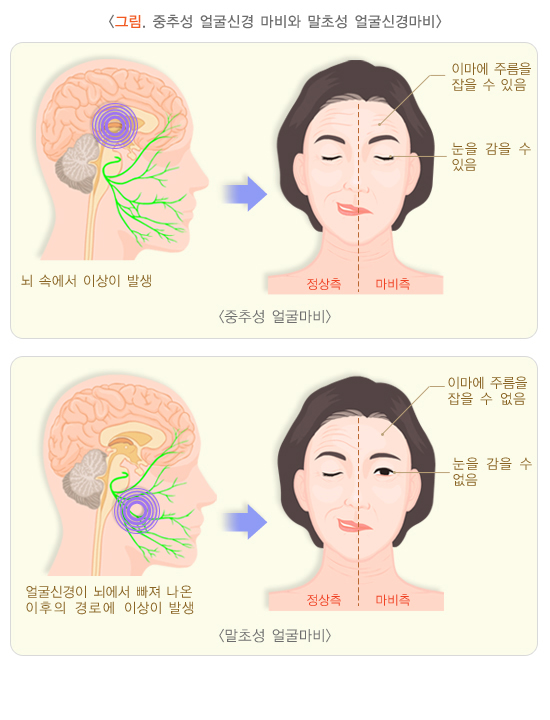 얼굴마비는 중추성 얼굴마비와 말초성 얼굴마비로 나눌 수 있습니다.
