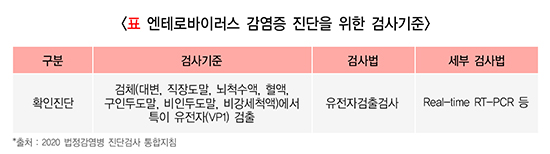 • 환자: 엔테로바이러스 감염증에 합당한 임상증상을 나타내면서 진단을 위한 검사 기준에 따라 감염병원체의 감염이 확인된 사람