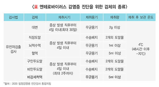 환자의 대변, 직장도말, 뇌척수액, 혈액, 구인도도말, 비인두도말, 비강세척액 등 검체에서 엔타로바이러스의 특이 유전자를 검출하면 진단할 수 있습니다. 이 때 대변이 가장 효과적인 검체입니다.