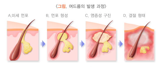 3) 모낭 내에 상주하는 균(Cutibacterium acnes)은 지방분해효소를 분비합니다. 이 효소가 피지 중의 중성지방을 분해해 유리 지방산을 형성하는데, 형성된 유리 지방산은 다시 모낭을 자극하여 모낭 벽을 터트립니다. 결국 피지, 세균, 탈락된 세포가 피부로 방출되어 홍반, 부종, 고름이 생깁니다.