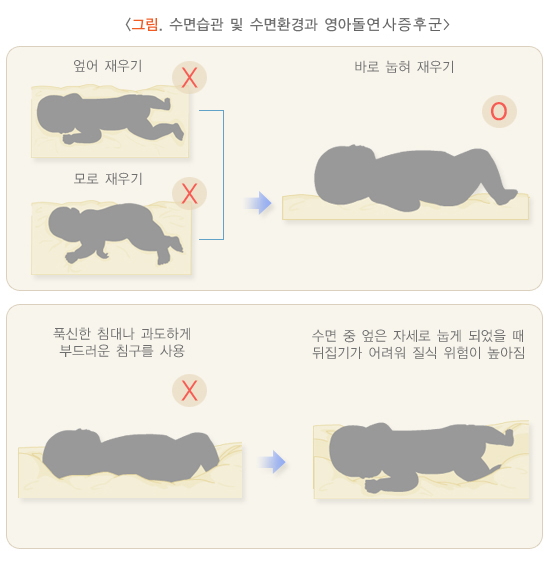 엎어 재우는 것은 이미 영아돌연사증후군의 가장 중요한 위험요소로 잘 알려져 있습니다. 가장 위험한 것은 이전에는 대개 똑바로 누워서 자던 아기가 지난 밤 엎드려 잤거나 엎드려 있는 채로 발견되는 경우입니다. 이런 경우는 대개 어린이집 등 보육기관에서 발생하는 경우가 많습니다. 따라서 아기를 돌보는 사람에 대한 교육이 필요합니다.