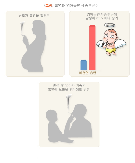 산모가 흡연했을 때 아기에게서 영아돌연사증후군이 발생할 위험이 높습니다. 연구에 의하면 산모가 흡연한 경우 태어난 아기에게서 영아돌연사증후군이 4배나 더 발생하는 것으로 나타났습니다. 산모의 흡연량이 많을수록 더 위험합니다. 출생 후 엄마나 다른 가족이 담배를 피울 경우에도 영아돌연사증후군이 발생할 위험이 높고 이 역시 흡연량에 따라 위험도가 올라갑니다.
