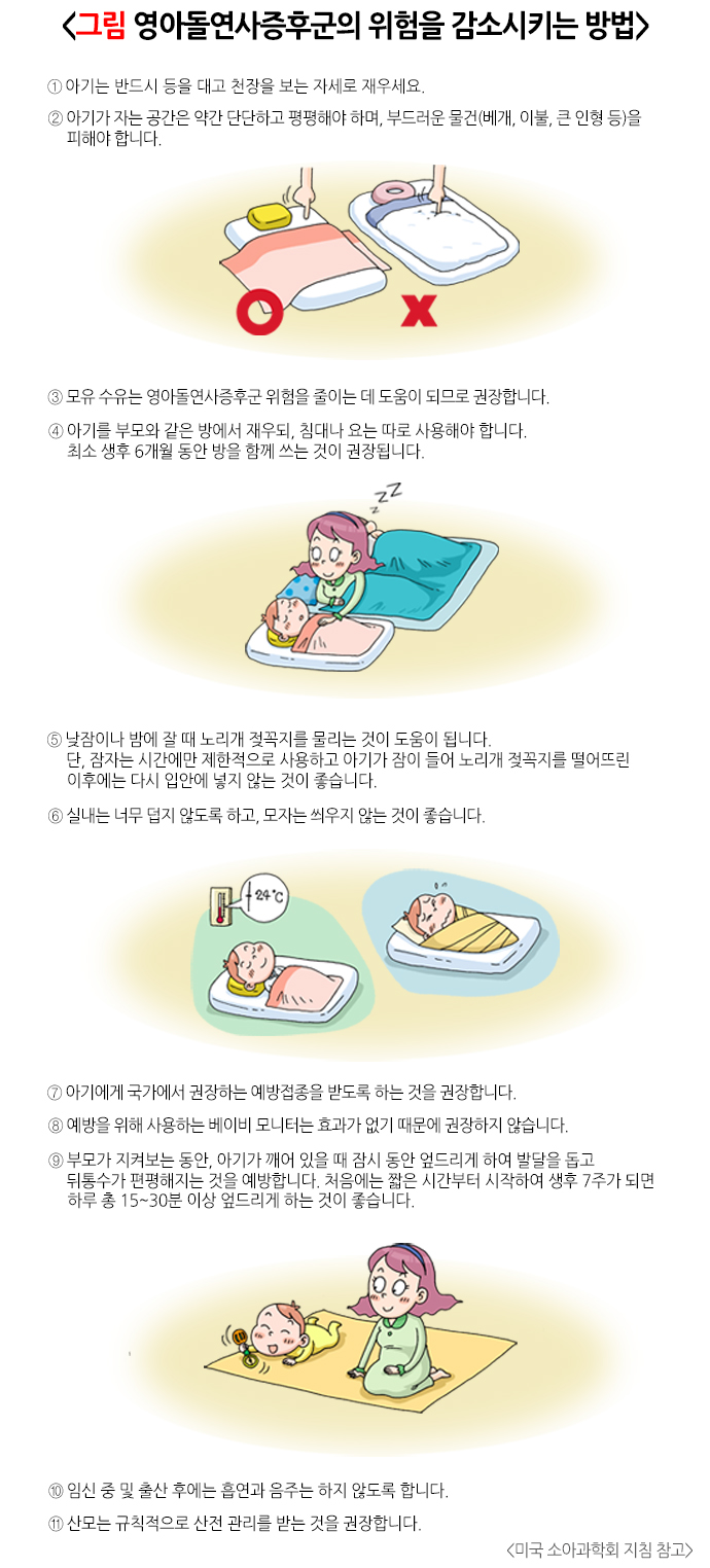 여러 나라에서 똑바로 눕혀 재우기 캠페인을 실시한 이후 영아돌연사증후군이 50% 이상 감소했습니다. 이처럼 위험요인을 줄이면 영아돌연사증후군의 발생을 줄일 수 있습니다. 그렇지만 개선이 가능한 위험요인도 있지만 인종이나 성별 등 개선이 불가능한 위험요인도 있습니다.