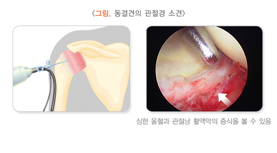 6개월 정도의 충분한 보존적 치료에도 불구하고 심한 구축을 보이면 관절경을 이용하여 관절낭 유리를 할 수 있습니다. 수술 전후 함께 시행한 도수 조작 (manipulation)은 수술 시야를 좋게 하고 해부학적 경계를 파악하는데 용이하여 많은 의사들이 선호하고 있습니다. 최근에는 도수 조작 없이 순수하게 관절경적 유리술만을 시행하여 도수 조작으로 야기될 수 있는 최소한의 문제점조차 줄이려고 노력하고 있습니다. 수술 전에 확인한 관절운동 제한범위와 관련된 구조물을 유리하여 만족스러운 관절운동범위를 얻을 수 있습니다.
