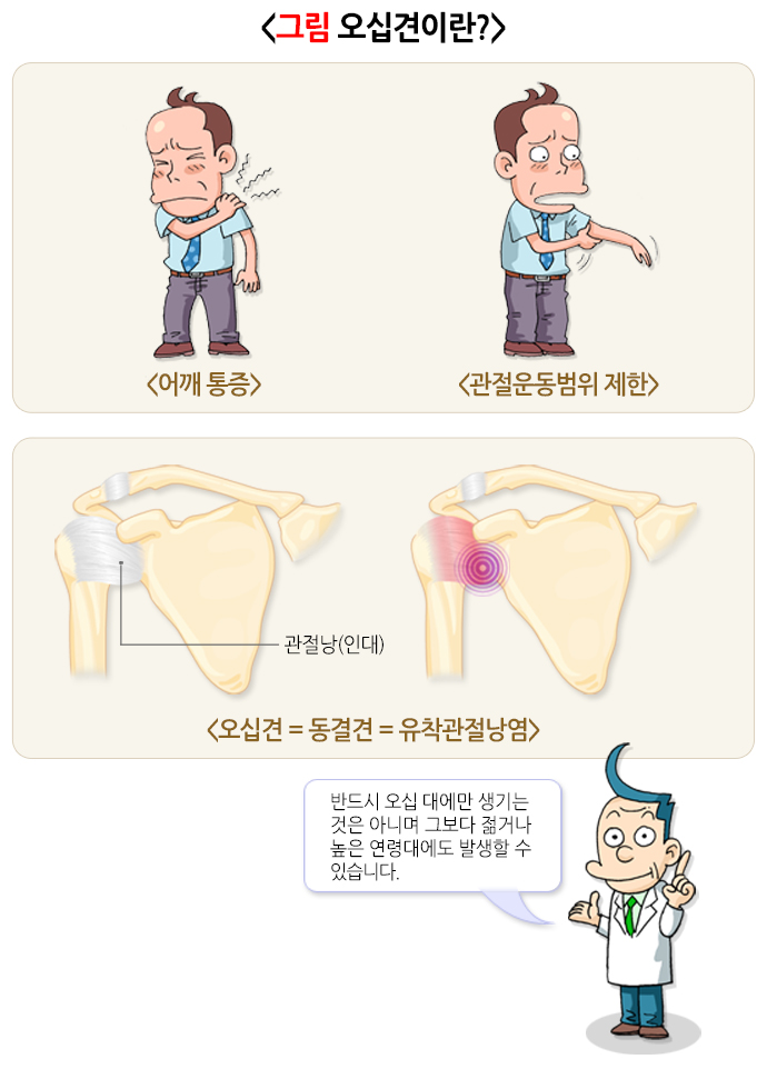 오십견은 만성 어깨관절의 통증과 운동제한을 일으키는 가장 흔한 질환의 하나로 전체 인구의 약 2%에서 나타나는 증상입니다. 이 질환은 Codman(1934)이 처음 “동결견(frozen shoulder)” 이라는 용어로 사용하기 시작하였습니다. 그 당시 이 질환 자체가 정의 내리기도 힘들고 치료하기도 힘들며 병인론에 대하여 설명하기가 힘들다고 하였고, 이 후 Neviaser(1949)가 이를 “유착관절낭염(adhesive capsulitis)”이라 기술하였으나 현재까지도 기전이나 치료에 대하여 명확한 해결책을 제시하지 못하고 있습니다. 흔히 50세 이후의 연령에서 나타나는데, 특별한 원인이 없이 관절운동이 되지 않으며 심한 통증을 유발하는 것이 특징입니다. 오십견 또는 동결견이라고도 하지만, 오십견이라 해서 반드시 50대에만 생기는 것은 아닙니다. 40대 이전이나 60대에서도 발생할 수 있습니다.