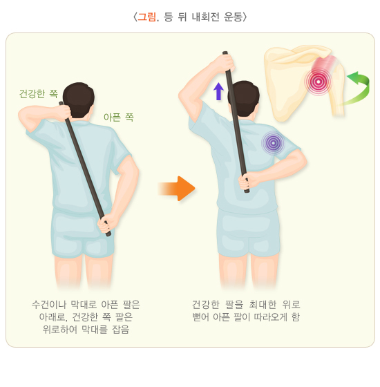 ③ 등 뒤 내회전운동은 목욕할 때 양손을 이용하여 수건으로 등 뒤를 밀어주듯이 운동을 하며 후하방 관절낭의 구축을 풀어줄 수 있습니다.
