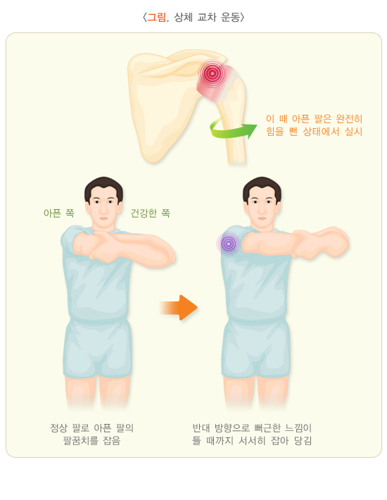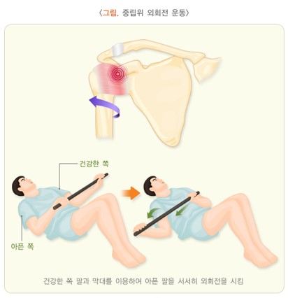 만약 운동 도중 통증이 계속되거나 심해지는 경우 운동의 강도를 조절해야 하며 운동량을 줄이거나 중단해서는 아무런 효과를 얻지 못합니다. 특히 등 뒤 내회전운동은 가장 하기 힘들고 가장 늦게 운동범위의 호전을 가져와 환자에게 미리 설명하는 것이 좋습니다. 어느 특정 부위의 관절운동범위만 제한이 있는 경우에는 어떤 구조물이 구축되었는지를 정확이 파악하여 선택적으로 신장운동을 해야 운동범위가 호전될 수 있습니다.