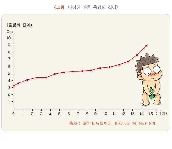 1987년 1,071명의 남아를 대상으로 평균 음경길이를 측정한 국내연구에서, 신생아의 평균 신장음경길이(쭉 펴서 측정한 음경길이)는 3.3 cm였습니다. 음경의 길이는 출생 후 4~5세까지 완만하게 성장하다가 그 후 정지기를 거쳐 사춘기의 시작인 10~11세에 다시 급격히 성장합니다. 14세군에서 평균 음경길이는 8.8 cm 정도입니다.