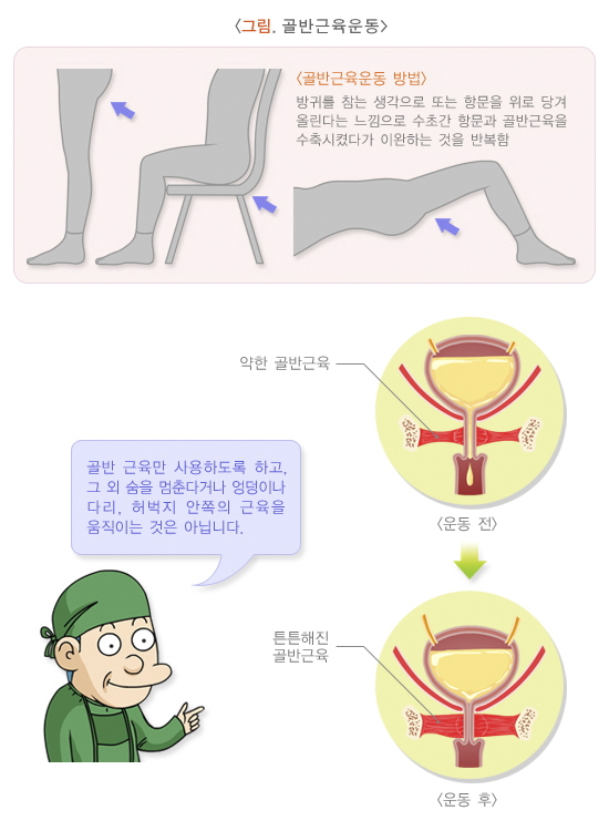 절박 요실금 또한 골반근육 훈련을 반복하면 방광 주변 근육의 힘이 강해지면서 갑작스러운 방광근육의 수축이 일어나는 것을 보완 조절하여 증상이 좋아지는 효과를 볼 수 있습니다. 생활습관 교정 및 약물에 효과가 없는 경우 방광내 근육을 부분 마비시키는 방광 내 보톡스 주입 수술을 하는 방법도 있습니다.