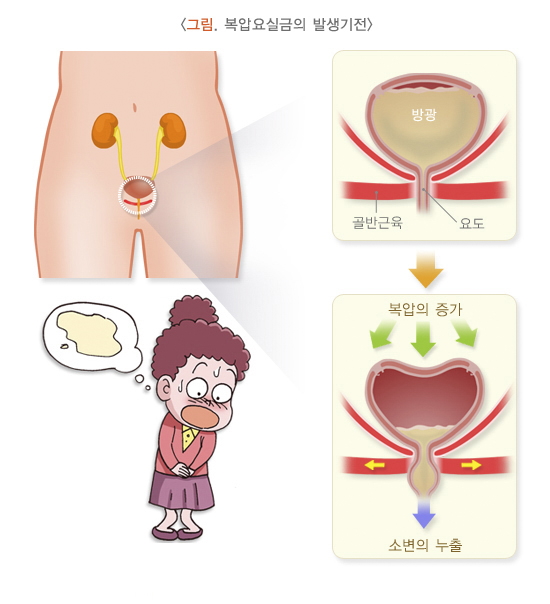 소변이 마려운 느낌이 강하고 급하게 들면서 참지 못하여 속옷을 적시는 종류입니다. 절박 요실금은 과민성 방광(overactive bladder)에서 나타나는 증상인 절박뇨, 빈뇨, 야간뇨 외에 추가로 보이는 증상입니다.
