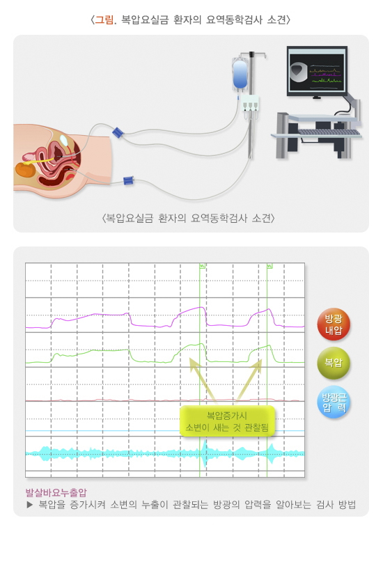 검사 방법은 얇은 튜브를 요도를 통해 방광 안에 위치시킨 후, 식염수를 소변을 볼 때까지 천천히 넣으면서 그동안의 방광의 변화를 측정하게 됩니다.