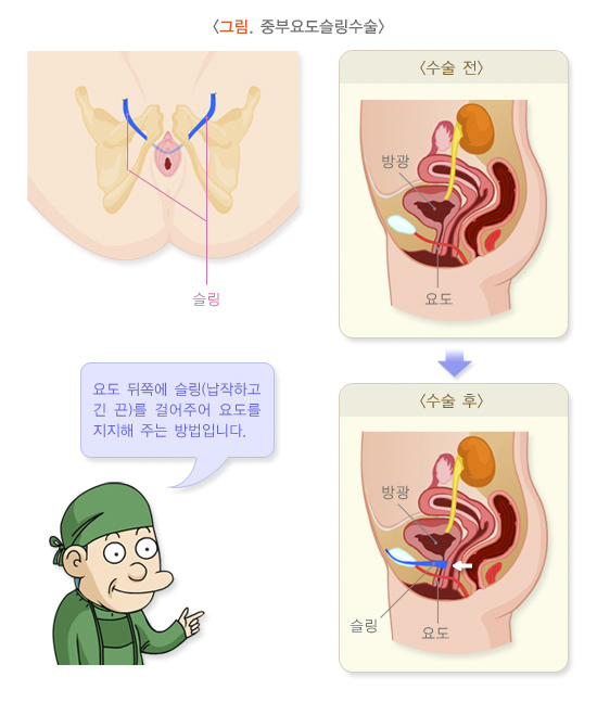 복압 요실금은 수술적 치료가 가장 효과적인 치료입니다. 30분 내로 간단하게 시행할 수 있는 중부요도슬링 방법이 보편화되어 있으며, 상처 부위도 1 cm 크기 정도로 작아 수술 후 일상생활로 바로 복귀할 수 있는 장점이 있습니다. 이 수술은 중부요도 부위에 의료용 끈 혹은 그물막을 삽입하여 약해져 있는 요도 지지구조물을 강화하는 지지대 역할을 하도록 도와주는 원리입니다. 수술 외에 생활습관 교정법도 매우 중요하며, 특히 비만 조절이 중요합니다. 생활습관을 교정하면서 골반근육운동(Pelvic floor muscle training)을 같이 하는 것이 큰 도움이 됩니다.