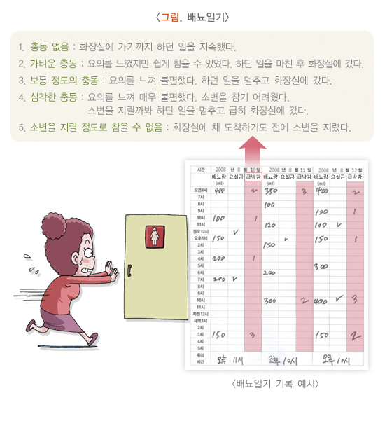 일상에서 요실금의 상태와 소변보는 양상을 확인하는 검사입니다. 스스로 언제 얼마나 소변을 보았는지를 3일 정도 기록하여 횟수, 배뇨량, 요실금 형태 등을 객관적으로 파악할 수 있는 중요한 검사입니다.