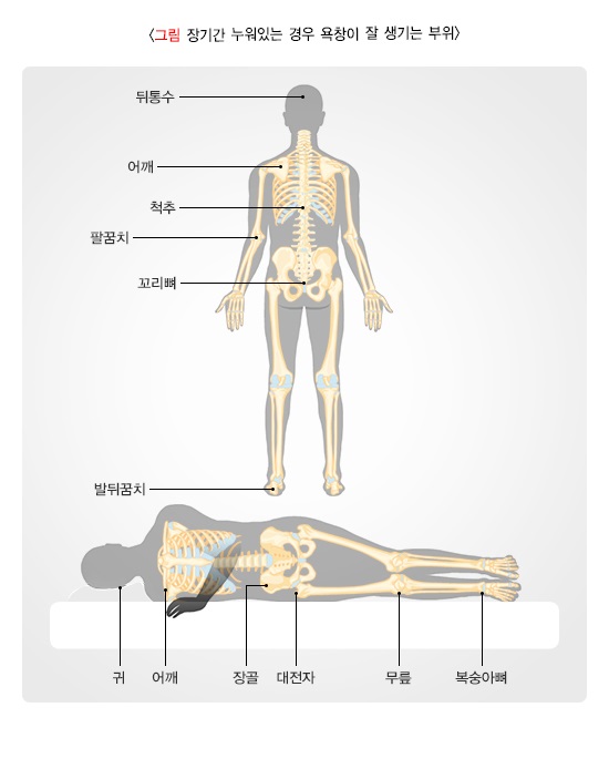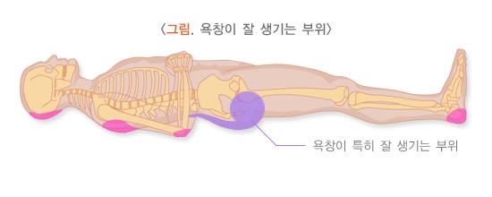 욕창은 뼈의 돌출 부위와 피부 표면에 긴 시간 동안 압력이나 전단력이 가해져 피부 및 연부 조직(물렁 조직)이 국소적으로 손상된 상태입니다.