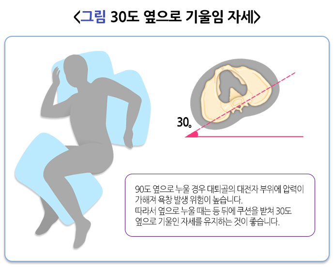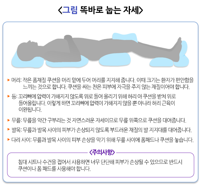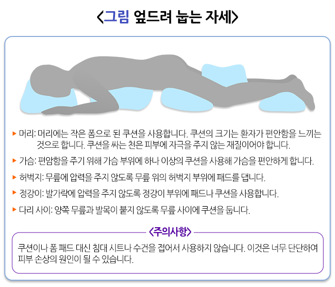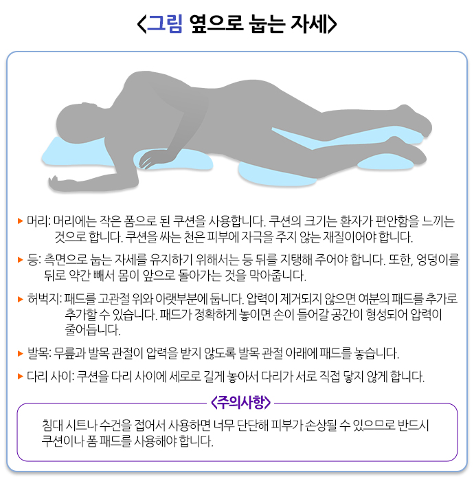 - 대전자(넓적다리 큰돌기)에 과도하게 압력이 가해지지 않도록 자세를 잡아주고, 지지 도구로 발꿈치를 올려 압력을 최소화합니다. 베개 또는 쿠션을 이용해 무릎이나 발목 같은 돌출부가 직접적으로 접촉하지 않도록 자세를 유지합니다.