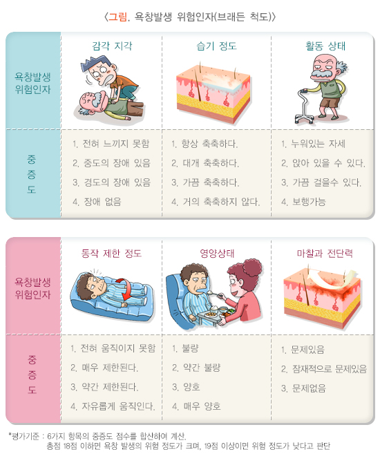 - 대표적인 욕창 발생 위험 평가 도구인 브래든 척도(Braden scale)는 감각 지각(Sensory Perception), 습기 정도(Moisture), 활동 상태(Activity), 동작 제한 정도(Mobility), 영양 상태(Nutrition), 마찰과 전단력(Friction/Shear) 등 6개 항목으로 이루어집니다. 각 항목은 4점 척도(마찰과 전단력 영역은 3점 척도)이고, 점수가 낮을수록 위험이 큰 것입니다. 18점 이하면 욕창 발생의 위험이 높으며, 19점 이상이면 위험이 낮다고 판정합니다.