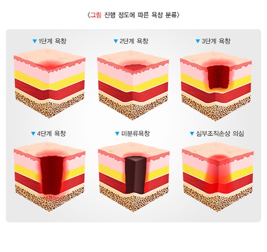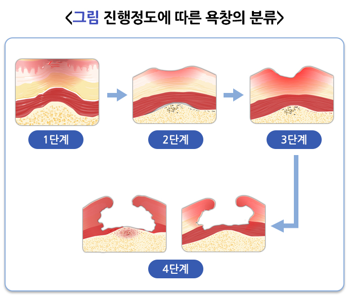 욕창은 임상 소견에 따라 4단계로 구분합니다.