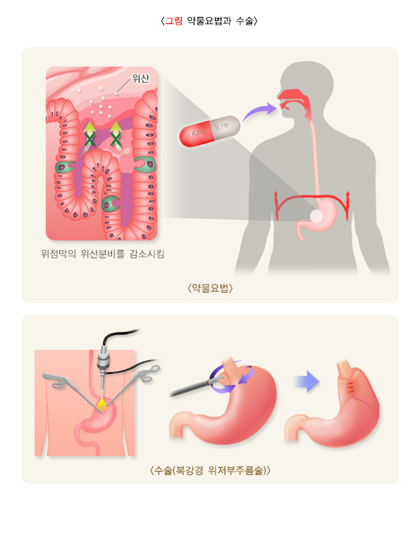 수술에 좋은 결과를 보이는 경우는, 전형적인 역류증상이 있으면서 pH 검사에서 병적으로 과다한 역류가 있고 약물치료에 반응이 좋은 환자입니다. 일반적으로 약물요법이 수술보다 안전하므로 초기 치료로는 약물투여가 추천됩니다. 하지만 약물 순응도가 떨어지거나, PPI 치료에도 불구하고 지속적으로 불편한 환자들에게는 항역류수술(antireflux surgery)을 권유합니다.