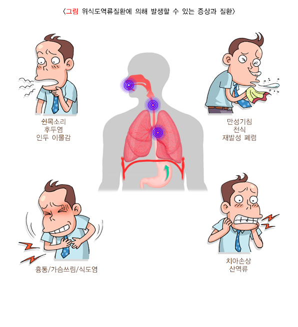 위식도역류질환은 역류가 지나치게 많이 일어나 식도로 넘어온 위산과 위속 내용물이 식도점막을 자극하여 쓰리고 아픈 증상을 일으키고, 심하면 식도염, 식도궤양, 협착 식도궤양, 협착 등을 일으킵니다. 때로는 역류된 위산이 식도를 지나 목까지 넘어와 후두염이나 천식, 만성기침을 일으키기도 합니다.
