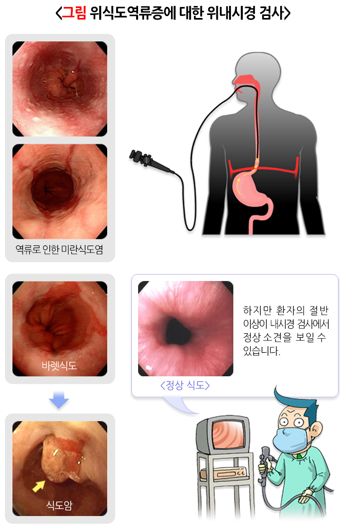 내시경 검사로 위산역류에 의해 일어난 식도손상을 확인합니다. 역류성식도염은 위식도 접합부에서 선상의 미란이 있으면 진단합니다. 역류식도염이 반복되면 식도구멍이 점점 좁아져 식도협착을 일으키고 음식물을 삼키기 힘들어지게 됩니다. 바렛식도는 위산역류가 장기간 계속되면서 생기는 식도의 변화로 식도선암으로 발전될 수 있으므로 정기적인 내시경 검사가 필요한 질환입니다. 내시경 검사는 가장 객관적인 방법이지만, 위식도역류질환 환자의 반 수 이상에서는 미란식도염이 관찰되지 않는 정상소견을 나타낸다는 제한점이 있습니다.