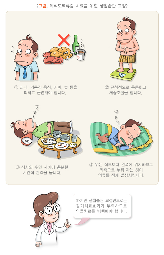 특히 복부 비만은 위식도역류질환 발생의 위험인자이지만 체중 감량만으로 증상이 개선되지 않으므로 약물치료와 병행할 필요가 있습니다. 체중 감량을 위해서는 식생활 개선을 비롯한 전반적인 생활습관의 교정이 필요합니다.