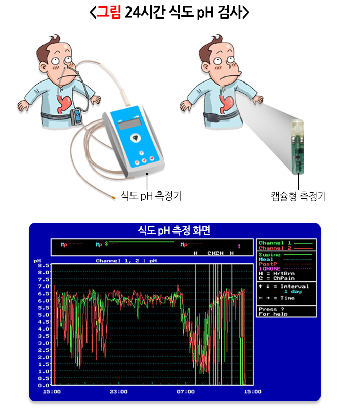 위식도역류질환을 진단하기 위해 다음과 같은 검사를 하고 있습니다.