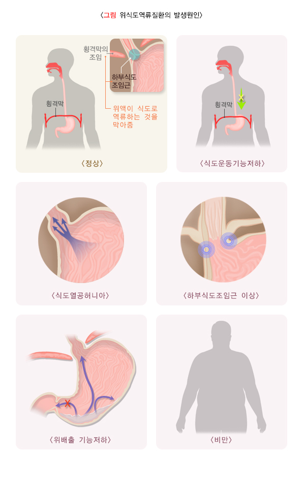 식도와 위 사이에는 식도조임근이 있는데 음식을 삼킬 때와 트림할 때만 열리고 평상시에는 꽉 조여 있어 위의 내용물이 거꾸로 식도 내로 역류하지 못하게 하고 있습니다. 식도조임근의 힘이 약하거나 부적절하게 열리면 위액이 식도로 거꾸로 넘어오게 되는데 이를 위식도역류라고 말합니다. 건강한 사람들도 가끔 위액이 역류되는 일이 있지만 이러한 경우 식도운동이 즉시 일어나 다시 위로 내려 보내기 때문에 대부분 증상을 일으키지 않습니다.