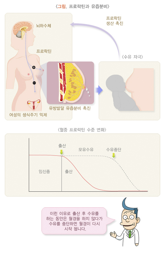 혈액 내 프로락틴은 임신 중에는 정상의 수십 배 정도까지 증가하며, 출산 후 2주 이내에 급격히 감소합니다. 모유 수유 중에는 혈액 내 프로락틴 수치가 계속 증가하는데, 아기가 젖을 빨 때 엄마 뇌의 시상하부를 자극하여 프로락틴 생산이 증가하기 때문이며, 이러한 효과는 약 30~45분 정도 지속됩니다.