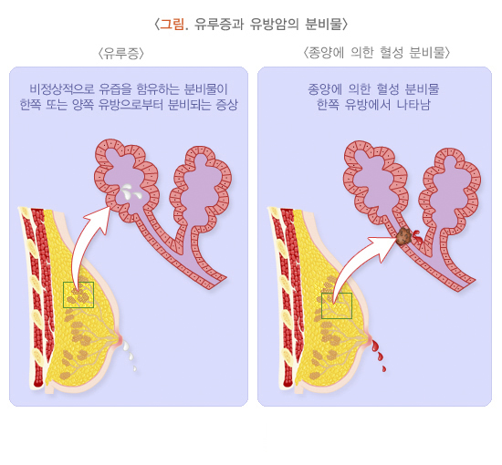 유루증과 구별해야 하는 중요 증상 중 하나는 유방암에 의한 혈성 분비물입니다. 이는 한쪽 유방에서 나타나며, 유방 초음파 검사나 유방 조영술을 실시해서 암이 있는지 반드시 확인해야 합니다.