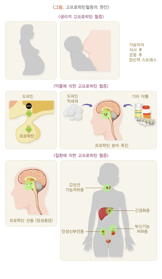 임신은 무월경을 동반하는 고프로락틴혈증의 가장 흔한 원인이며, 임신 말기에는 혈액 내의 프로락틴의 수치가 정상치의 약 10배 정도까지 증가합니다. 또한 출산 후 모유 수유로 혈액 내의 프로락틴이 증가합니다. 가슴 부위를 자극하거나 식사나 운동 후, 정신적인 스트레스 등에 의해서도 프로락틴이 증가할 수 있습니다.