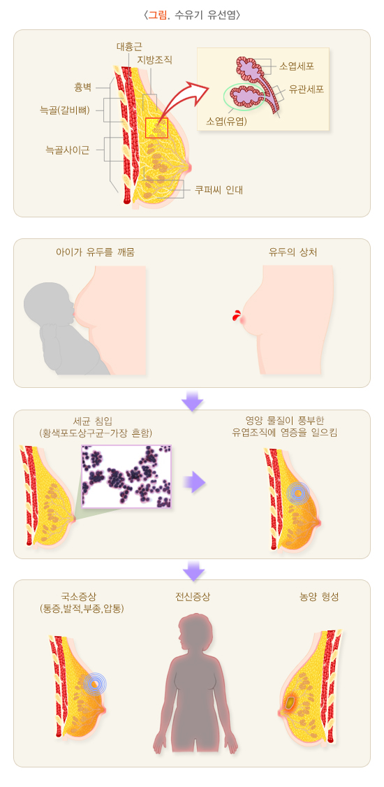 정상적인 여성에서 유방의 염증은 그리 흔한 것은 아닙니다. 그러나 수유기 여성에서는 유방 내 유선 조직과 젖샘이 발달하고, 유방 안에 모유가 많으므로 세균 감염이 생기면 급성 유선염으로 발전하기 쉽습니다.
