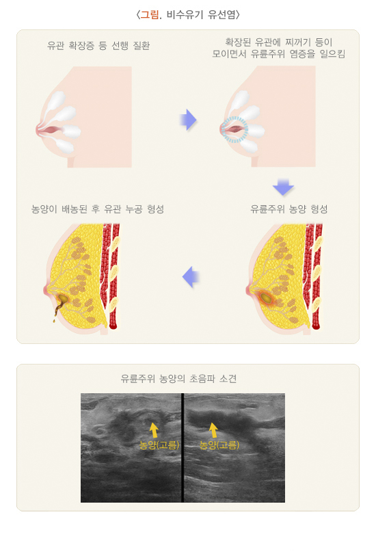 수유기 유선염은 세균이 유관을 통해 침투해 영양 물질이 풍부한 유엽 조직에 염증을 일으키는 경우를 말하는데, 아이의 입 속에 있던 세균이 모유수유를 하는 과정에서 유관을 통해 유선으로 침범하는 경우가 많습니다. 비수유기 유선염은 유엽 조직보다는 유관 조직, 특히 유륜 아래 유관 조직의 확장된 부위에 찌꺼기 등이 모여 염증을 일으키는 경우를 말합니다.
