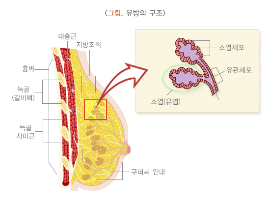 유방 조직은 크게 유선 조직과 그것을 지지하는 결체 조직 및 지방 조직으로 이루어집니다. 유선 조직은 젖을 만드는 소엽 조직과 젖을 유두로 운반하는 유관 조직으로 이루어지며, 15~20개의 유엽(소엽)과 이를 연결하는 유관이 유두로 연결되게 됩니다.
