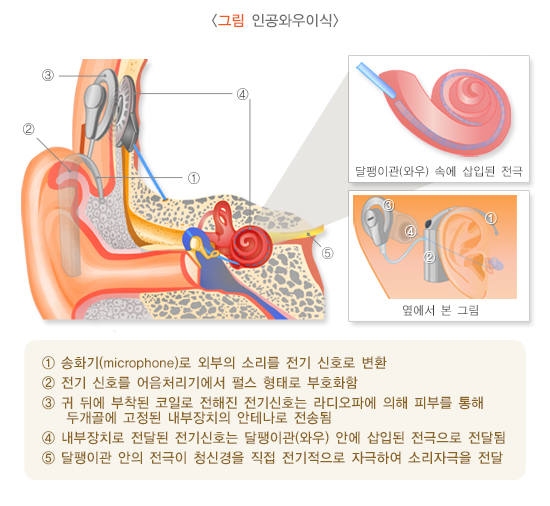 보청기로 소리를 크게 증폭해 주어도 청각과 언어 발달에 필요한 청각 정보 전달이 충분하지 않을 경우 인공와우이식 수술을 고려하게 됩니다. 인공와우이식 수술은 먼저 내부장치를 몸 안에 이식하게 되는데, 귀 뒤쪽의 두개골에 내부장치를 고정하고 달팽이관 안쪽에 내부장치에 연결된 전극을 삽입합니다. 이후 귀 뒤쪽에 자석으로 외부장치를 부착하면 외부의 소리 정보가 달팽이관 안쪽의 전극으로 전달되어 청각 신경을 직접 자극하여 작동합니다.