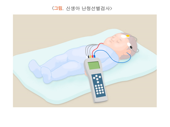 난청의 진단은 주파수별로 들을 수 있는 가장 작은 소리의 크기를 측정하는 순음청력검사와 말소리를 알아듣는 정도를 측정하는 어음청력검사를 기본으로 합니다. 그러나 이러한 표준적인 검사는 검사법을 이해하고 협조를 해줄 수 있는 나이가 되어야 시행할 수 있기 때문에 만 3세경부터 시도해 볼 수 있으나 일반적으로 만 5세 정도가 되어야 시행이 가능합니다. 이렇게 어린 아동의 경우에는 놀이적인 요소를 넣어서 검사하는 유희청력검사, 시각강화청력검사, 행동관찰검사 등을 시행할 수 있으나, 아동이 어릴수록 신뢰할 수 있는 결과를 얻기 어려워집니다. 따라서 어린 아동에서는 청각 자극에 대한 뇌파반응을 분석하는 검사인 청성뇌간반응검사와 청성지속반응검사를 대표적으로 활용합니다. 이들 검사는 소리가 들리는지 여부를 아동이 반응할 필요가 없기 때문에 객관적으로 청각역치를 신뢰하 수 있게 측정할 수 있습니다. 다만 검사 시간 동안 가만히 누워있어야 하기 때문에 아동에게 수면제를 먹이고 검사해야 하고 시간이 상대적으로 오래 걸리는 단점이 있습니다. 태어난 지 얼마 안되는 신생아에서는 자동화 청성뇌간반응검사와 자동화 이음향방사검사라는 검사법을 사용합니다. 신생아 청각선별검사에 쓰이는 이들 방법은 검사시간이 짧아 수면제를 먹일 필요가 없습니다. 다만 검사 시간이 짧은 대신 정확한 청각역치를 확인할 수는 없고 '통과' 혹은 '재검'으로만 검사 결과가 나옵니다. 재검이 나오는 경우에는 3개월 이내에 정밀청각검사를 통해 정확한 청각검사를 하고 치료 방침을 세워야 합니다.