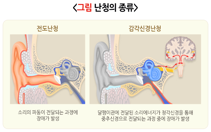 난청을 발생기전에 따라 나눌 수 있습니다. 소리를 청각 신경까지 전달하는 과정에 문제가 있는 전음성 난청과 소리를 듣는 청각신경세포 자체에 문제가 있는 감각신경성 난청으로 나뉘고, 이 두 가지가 함께 있는 혼합성 난청도 있습니다. 전음성 난청은 귓바퀴에서 귓구멍과 고막을 통해 내이의 달팽이관까지 소리를 전달하는 해부학적인 구조에 문제가 있어서 생기는 난청인데, 이러한 경우 수술로 잘못된 구조를 고쳐서 회복시킬 수 있습니다. 감각신경성 난청은 내이의 달팽이관에 있는 청각 신경 자체에 문제가 있어서 소리가 전달되어도 듣지 못하는 경우로, 일부에서 약물 치료가 가능하기도 하지만 대부분은 청각 세포를 다시 살릴 수 없기 때문에 보청기 등의 청각재활기기를 사용해서 치료하게 됩니다.