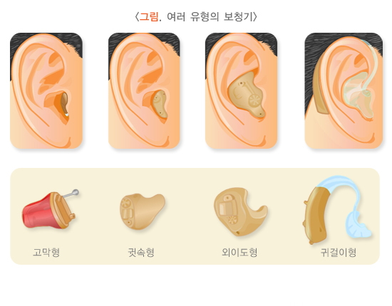 청각 재활의 방법은 보편적으로 보청기를 먼저 사용하고, 보청기로도 청각 자극이 불충분해 언어발달에 문제가 있는 경우에는 인공와우이식술을 시행할 수 있습니다. 보청기의 형태는 귀속형에서 귀걸이형까지 여러 가지 형태가 있습니다. 어린 아동의 경우 귓구멍과 외이도가 빨리 자라고 있기 때문에 귓구멍에 맞춰 끼는 형태보다는 귀걸이형을 권하는 경우가 많습니다.