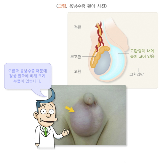 음낭수종(hydrocele), 또는 물음낭증은 음낭(고환집) 안에 체액이 과도하게 고여 음낭이 부풀어 오르는 질환입니다. 구조적으로 고환은 ‘고환집막’이라는 얇은 막에 둘러싸여 있는데, 이 막과 고환 사이의 공간에 체액이 고이면서 음낭수종이 발생하게 됩니다.