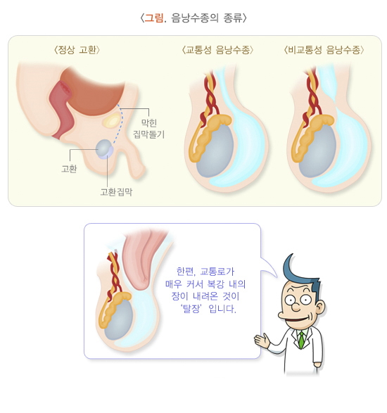 비교통성 음낭수종은 음낭이 복강과 연결되어 있지 않으면서, 닫혀 있는 음낭 내 공간에 체액이 고여 생깁니다. 반면, 교통성 음낭수종은 음낭과 복강 사이에 통로가 남아 있어, 복강 내 체액(복수)이 음낭으로 흘러 들어오면서 발생합니다. 보통 성인에게는 비교통성 음낭수종이, 소아에게는 교통성 음낭수종이 더 흔하게 나타납니다.