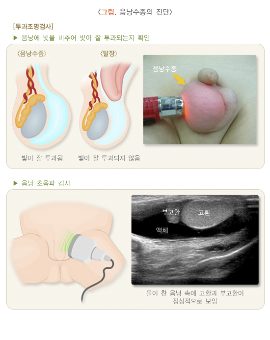 음낭수종의 진단은 병력청취, 신체검사, 투과조명검사, 초음파 검사 등을 통해 이루어집니다.