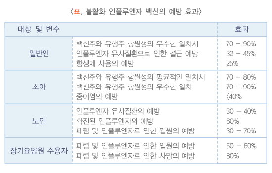 인플루엔자 백신은 인플루엔자 발병을 완전히 예방하지는 못하지만 임상 증상 및 경과의 완화, 입원율 및 사망의 위험을 낮추는 효과가 있습니다.