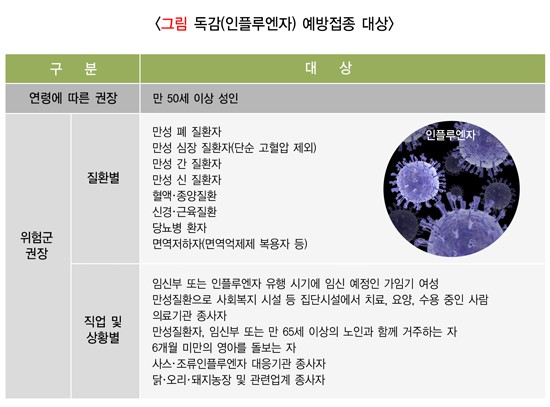 WHO에서는 매년 2월 말에 그 해 겨울철에 유행할 것으로 예상되는 A형 H3N2, A형 H1N1 및 B형 바이러스주 각각 1가지씩 모두 3가지 바이러스주를 백신주로 발표하며, 이에 의거하여 백신회사들은 백신을 생산합니다. 인플루엔자 백신은 적어도 유행 최소 2주전에 맞아야 효과적이므로 고위험군에 대한 백신접종은 10월, 11월 중에 시행되어야 합니다. 그 이후라도 백신을 접종받지 않은 사람은 인플루엔자 절기 중 접종하여야 합니다. 과거 인플루엔자 백신을 맞은 적이 없는 6개월~9세 어린이는 1개월 간격으로 2회 접종받아야 합니다. 6~35개월 어린이는 0.25 mL, 3세 이상 어린이는 0.5 mL를 근육에 주사하며, 성인 및 큰 어린이는 윗팔 삼각근에, 영유아 및 어린이는 허벅지 근육 앞쪽에 접종합니다.