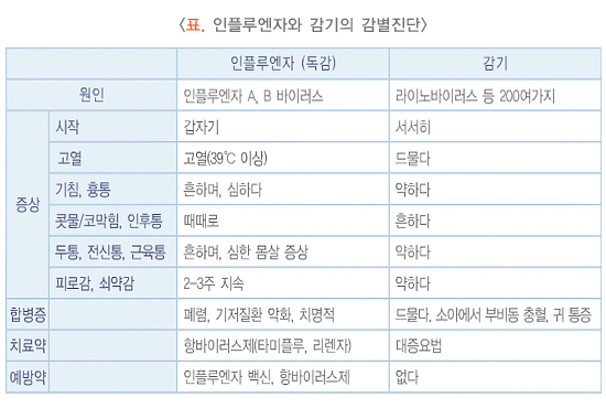 감별 진단을 위해 중요한 점은 인플루엔자는 감기와 달리 갑작스럽게 시작되기 때문에 고열(38~41℃)이 시작된 시점을 정확하게 기억할 수 있다는 것입니다. 이에 비해 감기는 미열이 서서히 시작되기 때문에 증상이 시작된 정확한 시점을 잘 기억하지 못합니다. 또한 인플루엔자는 두통, 피로감, 근육통, 관절통 같은 "심한 몸살"이라고 표현하는 전신 증상이 뚜렷하여 일상생활이 어려울 정도입니다. 고열과 심한 근육통 등은 초기 2~3일 동안 심하며, 이후에는 나아집니다. 감기는 미열과 함께 콧물, 코막힘, 인후통 같은 상기도 증상이 주로 나타나며, 전신 증상은 약해서 일상생활에 큰 지장을 주지 않습니다. 반면에, 인플루엔자는 기침, 인후통 같은 호흡기증상은 전신 증상이 나아질 때 나타나며, 어떤 환자들은 기침이 1주 이상 계속되면서 가슴 통증을 동반하기도 합니다. 고열이 지속되고 기침, 누런 가래, 호흡곤란 등의 증상이 나타나면 폐렴과 같은 하부호흡기 합병증의 발생을 의심해야 합니다. 단순 인플루엔자에서 급성 증상과 징후는 대개 2~5일에 걸쳐 나아지며 대부분 1주일 내에 거의 회복되지만, 기침은 몇 달 이상 계속될 수 있습니다. 노인 등 극소수는 쇠약감 또는 나른함(인플루엔자 후 무기력증)이 몇 주 동안 계속될 수 있습니다.