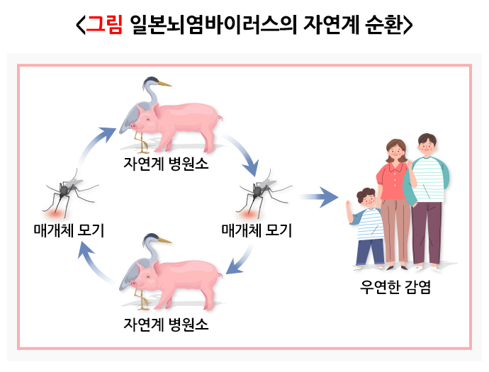 일본뇌염 바이러스는 다양한 종류의 모기에 의해 전파될 수 있습니다. 우리나라에서는 주로 작은빨간집모기(Culex tritaeniorhynchus)를 통해 전파됩니다. 보건 당국에서는 정기적으로 작은빨간집모기의 밀도와 분포를 조사하여 일본뇌염 주의보와 경보를 발령하고 있습니다. 일본뇌염 바이러스의 자연계 순환은 그림과 같습니다. 일본뇌염 바이러스에 감염된 모기가 돼지나 야생의 새를 물면서(흡혈) 바이러스가 해당 동물에게 전파되고, 그 안에서 바이러스가 증폭됩니다. 그리고 바이러스에 감염되지 않은 모기가 감염된 돼지나 야생의 새를 흡혈하면서 전파가 순환하면서 반복되게 됩니다. 사람은 이러한 순환과정 속에서 감염된 모기에게 물려서 일본뇌염에 걸리게 됩니다. 따라서 사람 간의 직접적인 전파는 없는 것으로 알려져 있습니다.