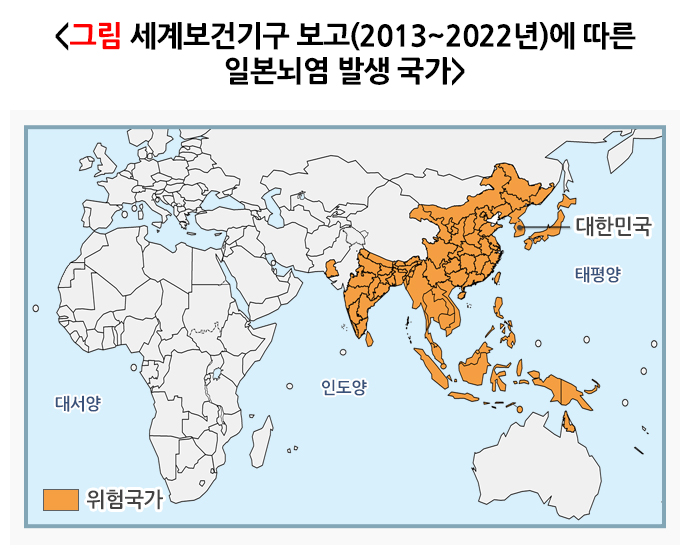 일본뇌염은 주로 아시아와 서태평양 국가에서 발생하고 있습니다. 세계보건기구의 자료에 따르면 전 세계적으로 매년 68,000여 명의 환자가 발생하고 있으며, 그 중 약 13,600~20,400명이 사망하는 것으로 나타났습니다. 온대지역에서는 계절성 유행 양상을 보여 주로 여름과 가을에 환자가 발생하고, 열대 또는 아열대 지역에서는 연중 발생하고 있습니다.