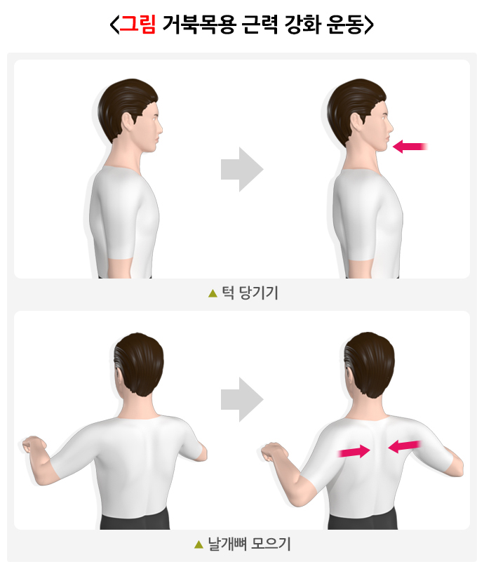 • 근육 강화는 주로 목 앞쪽의 속 근육과 등 뒤쪽, 날개뼈 사이의 근육을 대상으로 합니다. 턱을 당기거나 날개뼈를 모으는 동작을 약 20-30초간 유지합니다.